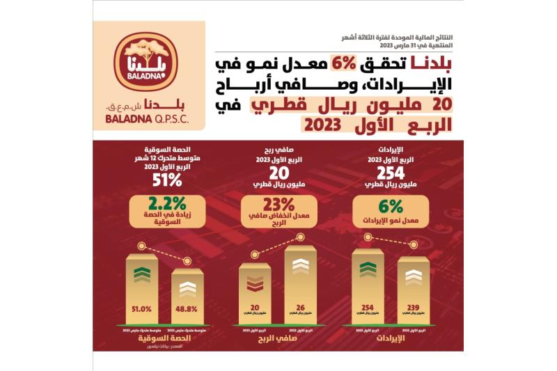 أفصحت شركة بلدنا عن نتائجها ربع السنوية لفترة الثلاثة أشهر المنتهية في 31 مارس 2023 (الربع الأول 2023). وبلغ حجم الإيرادات 254 مليون ريال قطري وهو ما يمثل معدل نمو سنوي 6٪ وأرباحاً صافية قدرها 20 مليون ريال قطري لفترة الثلاثة أشهر المنتهية في 31 مارس 2023، مقارنة بإيرادات قدرها 239 مليون ريال قطري وصافي ربح قدره 26 مليون ريال قطري خلال نفس الفترة من العام الماضي. نمو قوي في الإيرادات في كل من قطاع الهوريكا (الفنادق والمطاعم والكافتيريا) وقنوات البيع بالتجزئة مدفوعة بمبادرات الإدارة للاستفادة من تحسن ديناميكيات السوق. زيادة الحصة السوقية عبر غالبية فئات المنتجات متمثلاً في زيادة حجم المبيعات. تعظيم الاستفادة من محفظة المنتجات من خلال إدخال منتجات جديدة إلى السوق وشطب المنتجات ذات الأداء المنخفض. وحققت بلدنا إيرادات بقيمة 254 مليون ريال قطري لفترة الثلاثة أشهر المنتهية في 31 مارس 2023، مقارنة بـ 239 مليون ريال قطري لنفس الفترة من العام الماضي، وهو ما يمثل نمواً سنوياً بنسبة 6٪. كما حققت بلدنا أرباحاً صافية قدرها 20 مليون ريال قطري في الربع الأول من عام 2023، مقارنة بـ 26 مليون ريال قطري في الربع الأول من عام 2022. ولا تزال القيود المفروضة على قدرة بلدنا على زيادة أسعار البيع لتعويض تأثير زيادة التكاليف تؤثر على هوامش أرباح الشركة. وتقوم إدارة بلدنا حالياً بإجراء مناقشات نشطة مع السلطات التنظيمية المعنية لتوضيح الآثار السلبية لبيئة الاقتصاد الكلي على هوامش ربحية الشركة. والشركة على ثقة من أن الجهود المبذولة لإيصال الأمر بشكل فعال إلى السلطات المعنية ستؤدي إلى استجابة إيجابية في المست...
