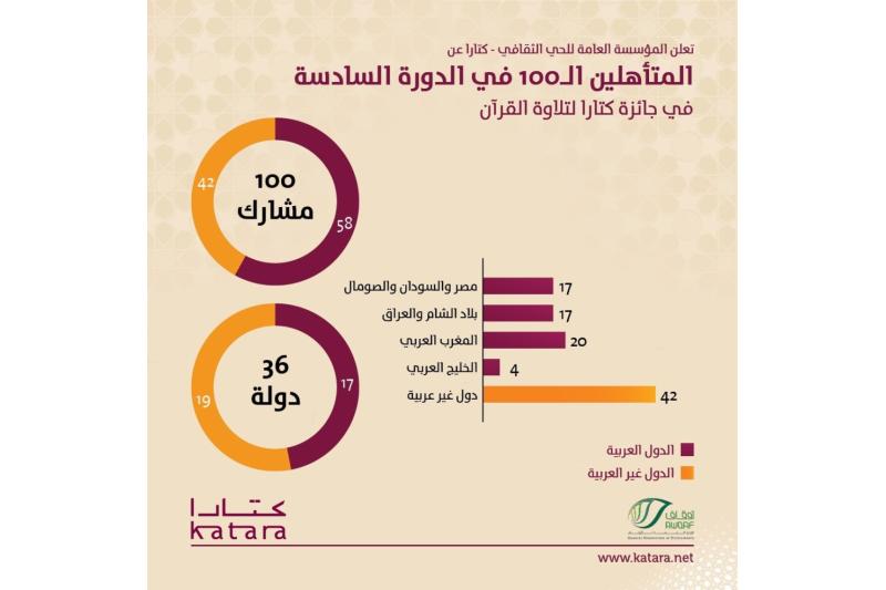 أعلنت المؤسسة العامة للحي الثقافي /كتارا/، عن تأهل 100 مشارك للتصفيات النهائية لجائزة كتارا لتلاوة القرآن الكريم في دورتها السادسة 2023، التي نظمتها تحت شعار
