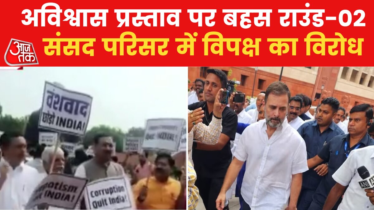 अविश्वास प्रस्ताव पर आज दूसरे दिन बहस होगी. कांग्रेस की ओर राहुल गांधी 12 बजे मणिपुर के मुद्दे पर सरकार को घेरने उतरेंगे. इस बीच अब संसद परिसर में विपक्ष का विरोध जारी है. देखें ये वीडियो.