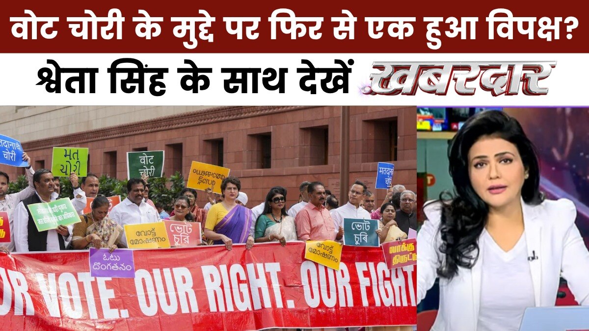 खबरदार में आज कई प्रमुख घटनाक्रम शामिल हैं. विपक्ष ने वोट चोरी के गंभीर आरोप लगाए हैं, जिसके विरोध में चुनाव आयोग के खिलाफ संसद से सड़क तक मार्च निकाला गया. इस मार्च में 300 सांसद शामिल हुए, और अखिलेश यादव ने पुलिस बैरिकेड लांघ दिया. विपक्ष ने इसे संविधान और 'वन मैन वन वोट' के अधिकार की लड़ाई बताया.