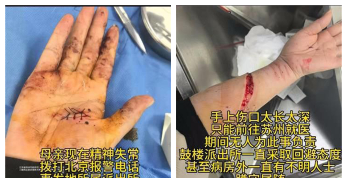 3月4日下午3点左右,张萍在租屋处又被一群自称北京警察的人破门而入,张萍再次失联。3月5日,张萍浑身是血出现在泰兴鼓楼派出所,精神已经失常。她手臂上有多道伤口,最长伤口达12公分,没有任何处理。鼓楼派出所叫来120将她送到泰兴医院治疗,由于伤口太长,裸露时间太久,怕有重大感染风险,泰兴医院拒绝缝合治疗,后转至苏州广济医院。