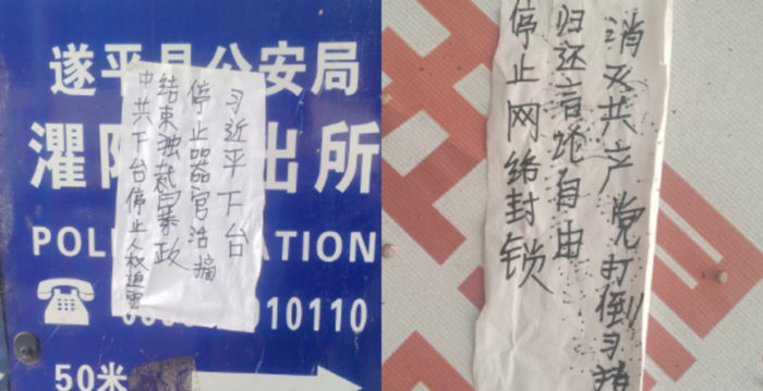 中共二十届四中全会后,中国网络传出,河南省驻马店市遂平县街头出现多张要求“习近平下台”“中共下台”“停止人权迫害”等内容的反共标语。