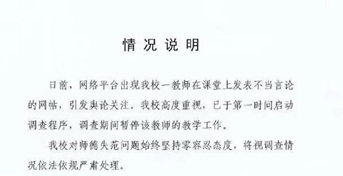 事后,网上传出一份南京航空航天大学党委教师工作部3月8日所发的“情况说明”称,近日网络平台出现该校教师在课堂上发表不当言论的网帖,引发舆论高度关注。该校第一时间启动调查程序,调查期间暂停涉事教师的教学工作。