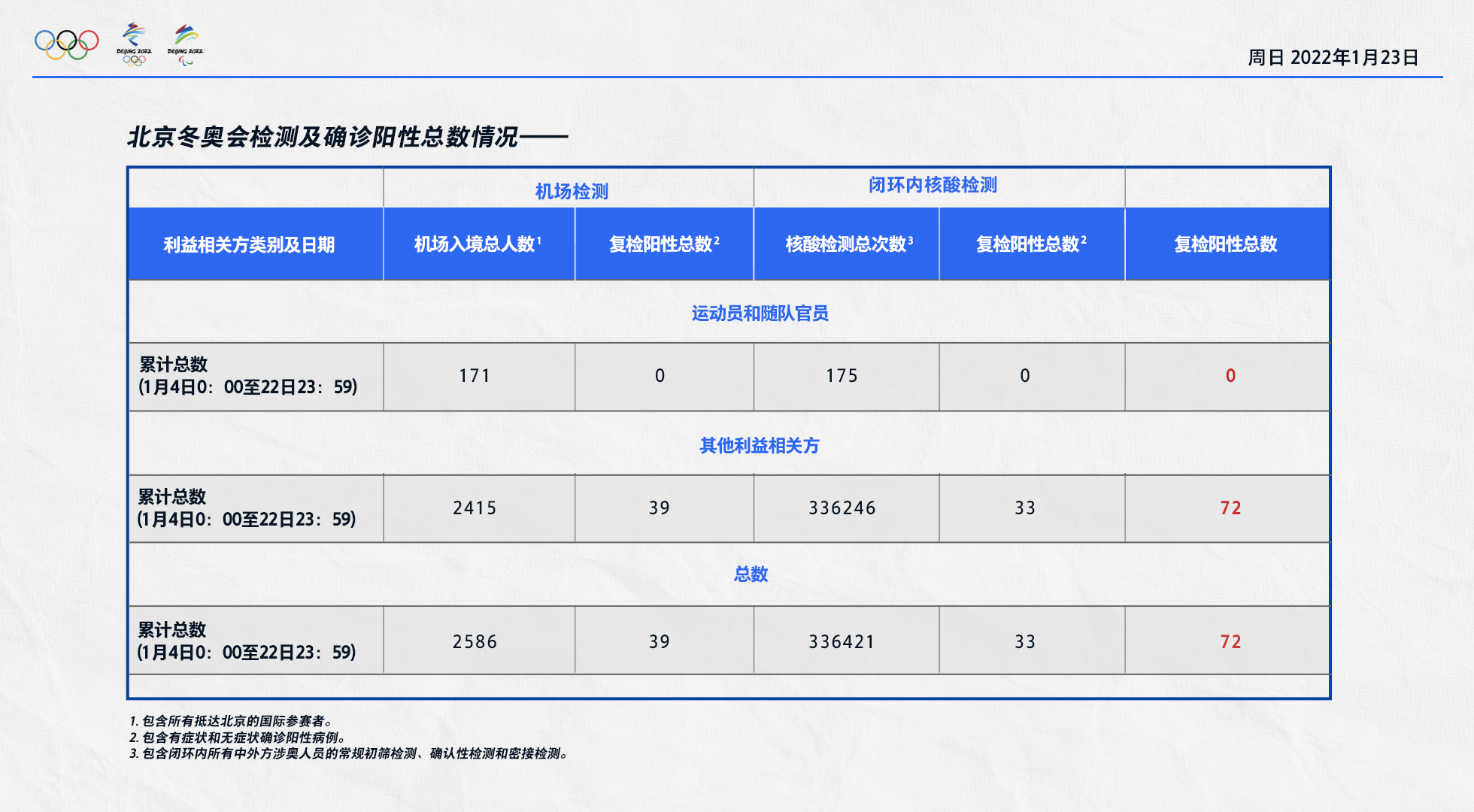 北京冬奥组委:1月4日-22日核酸复检阳性总数72人 运动员和随队官员无阳性