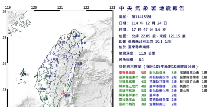台湾中央气象署表示,今天(24日)下午5时47分发生芮氏规模6.1地震,地震深度11.9公里,震央位于台东县政府北方10.1公里(位于台东县卑南乡)。