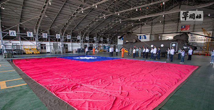 中华民国国庆筹备委员会日前公布即将在今年国庆大会登场的巨幅国旗照片,总长18公尺、宽12公尺、重45公斤,摊开占地约65坪,预计在双十国庆当日由陆军CH-47SD直升机吊挂。