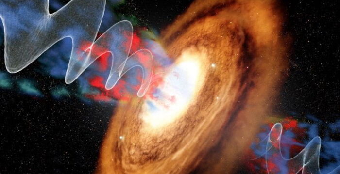 天文学家知道,这种气体喷流的形成是因为气体中产生的极端温度和磁场落入星系中心活跃的超大质量黑洞内。喷流会形成螺旋状图案,产生一种被称为“喷流进动”(jet precession)的现象,它描述了喷流方向随时间的变化,类似于旋转陀螺的周期性摆动。