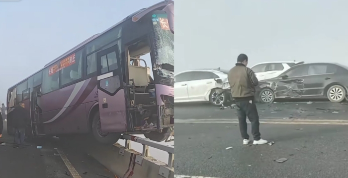 1月2日,开封黄河公路大桥发生多车连续追尾事故,一辆大巴车避险冲上护栏,车头悬空险些坠桥。