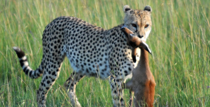 野狗通常不会单独行动,但罗宾逊看到的那一只野狗却独自抓到黑斑羚。这一幕被附近的猎豹看到了。它知道野狗没有同伴,所以很轻易地抢走了它的猎物。