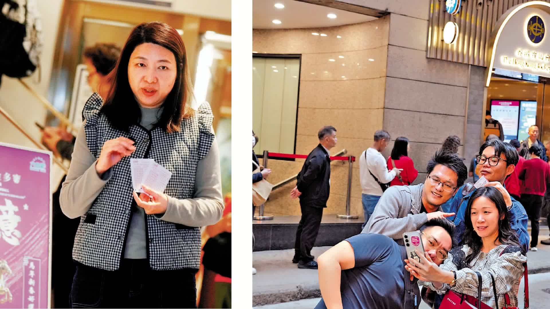 (大公報記者張騰報道)六合彩新春金多寶將於今晚攪珠,若頭獎一注獨中,獎金估計高達2億元,創歷來新高。截至昨晚11時,投注額已突破1.9億元。在中環士丹利街的投注站場面墟冚,昨整日大排長龍,大部分時間有二、三百人排隊,輪候近兩小時購買六合彩。 大公報記者昨日下午在士丹利街投注站現場觀察,馬會職員手持寫着「龍尾」的手牌,於人龍隊尾提醒市民。有職員表示,投注站昨日未開門前已有人在外面排隊等候買六合彩,下午人潮持續。他不斷向排隊的市民表示,可考慮使用現金券避免排隊,惟未見排隊的人離開。 不少輪候人士表示,知道頭獎獎金創新高,所以到來投注希望一圓橫財夢。來自荷蘭、現居沙田的Jason向大公報記者表示,按照馬會網頁上的十大幸運投注處名單,逐區前往買六合彩,中環士丹利街已是第四、五個投注站,合共買了十多張彩票,花費200元投注,希望中頭獎,獎金用來買樓自住。
