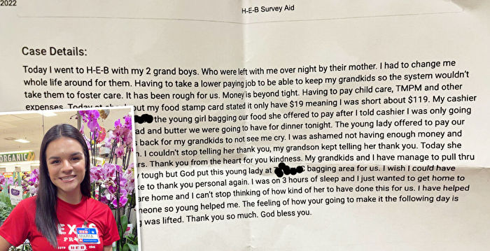 “当时,我不知道那两个孩子是她的孙子”,玛丽亚告诉《大纪元时报》,“她使用政府援助的SNAP卡来付款,但里面只剩下19美元了。”
