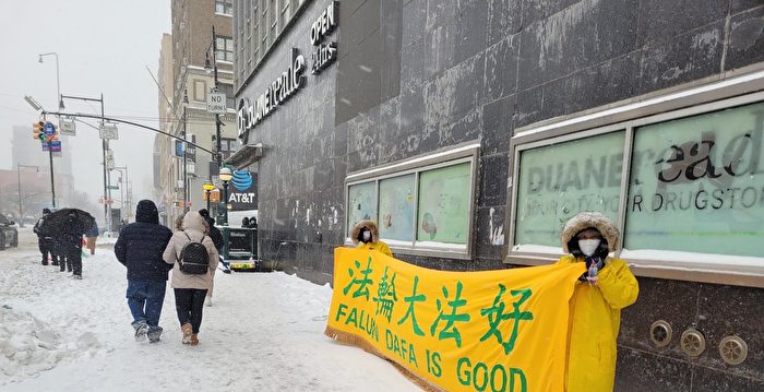 暴风雪挡不住 纽约法轮功学员坚守真相点