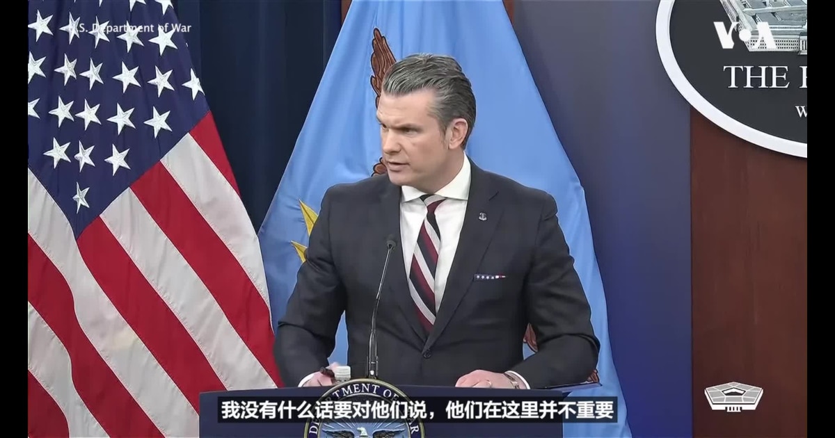 美国战争部长皮特·海格塞斯(Pete Hegseth)星期三(3月4日)表示,在美国领导的针对伊朗的行动中,中国不是一个考量因素。海格塞斯星期三在五角大楼与美国参谋长联席会议主席丹·凯恩(Dan Caine)将军共同主持记者会时被问到,他有什么信息需要传达给伊朗的盟友中国和俄罗斯。海格塞斯说:“我没有什么话要对他们说,他们在这里并不重要,我们的问题不在于他们,而在于伊朗的核野心。”