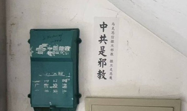 9月9日,有网友在海外X平台发文表示,中共国墙内人民在觉醒,灭共达到高潮,辽宁沈阳、大连的居民楼中也出现灭共标语:“中共不等于中国!”“中共是邪教!”等,在该标语旁边还有一行小字,上面写着:“马克思信撒旦邪教,撒旦是恶魔。”