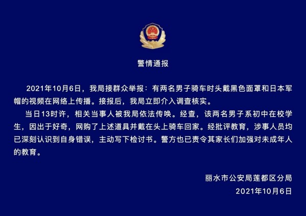 2021年10月6日,我局接群众举报:有两名男子骑车时头戴黑色面罩和日本军帽的视频在网络上传播。接报后,我局立即介入调查核实。