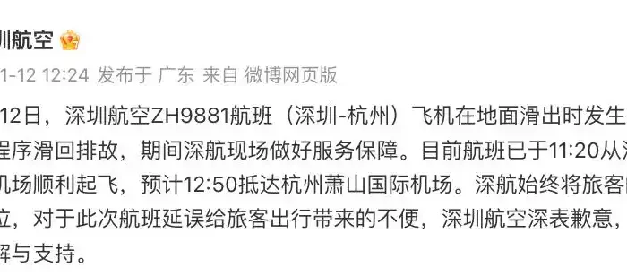 深圳航空官方微博1月12日中午发通报称,1月12日,深圳航空ZH9881航班(深圳-杭州)飞机在地面滑出时发生故障。机组按程序滑回排故。
