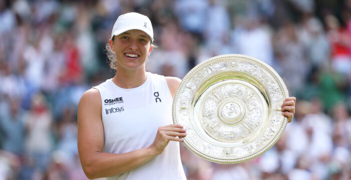 当地时间7月12日,在温布尔登网球公开赛女单决赛上,前世界第一、波兰名将伊加‧斯维亚特克(Iga Swiatek)以两个6:0轻取第一次闯入大满贯决赛的23岁美国好手阿尼西莫娃(Amanda Anisimova),打破了自己长达一年多的“冠军荒”,首夺温网女单冠军,将个人大满贯冠军提升至六个,其世界排名将升至世界第三。