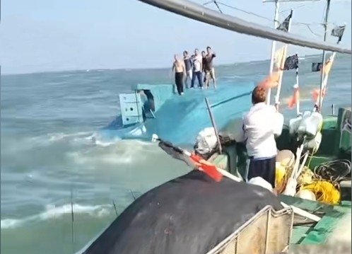 网传视频显示,一艘船倒扣在海上,船底上站着5个人正在等待救援,一艘渔船正向事故船只靠近,准备施救。