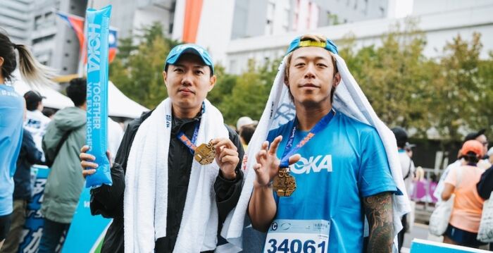 团体“玖壹壹”成员洋葱与健志,一路参与跑鞋品牌台北马训练营,并于21日顺利完赛半程马拉松,并双双突破个人最佳纪录,分别为 1 小时50分、2小时20分成绩。