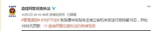 此前据媒体报道,辽宁盘锦一私家车公然张贴印有“支那制造”、“武运长久”等辱华字样的车贴,引发网友热议。接到网友举报后,盘锦市警方立刻传唤车主张某询问并对其进行批评教育,民警对该车主称“不抓你对不起全国人民,对不起所有牺牲的烈士”。10月2日,盘锦警方发布通报,张贴辱华车贴车主已被公安机关依法行政拘留15日,并处1000元罚款。