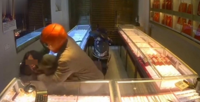 根据此前曝光的监控画面显示,金店卷帘门正在关闭时,一个戴着头盔的男子从门缝钻进来,进门时手持发光的电棒。他迅速翻过了1米多高的柜台,追打女店主。在逃走过程中,女店主遭到殴打和电击,大声呼叫救命,但对方追击并持续电击女店主,时长数分钟。最后女店主被控制,嫌疑人敲碎两个柜面,抢走首饰后从卷帘门下逃跑。