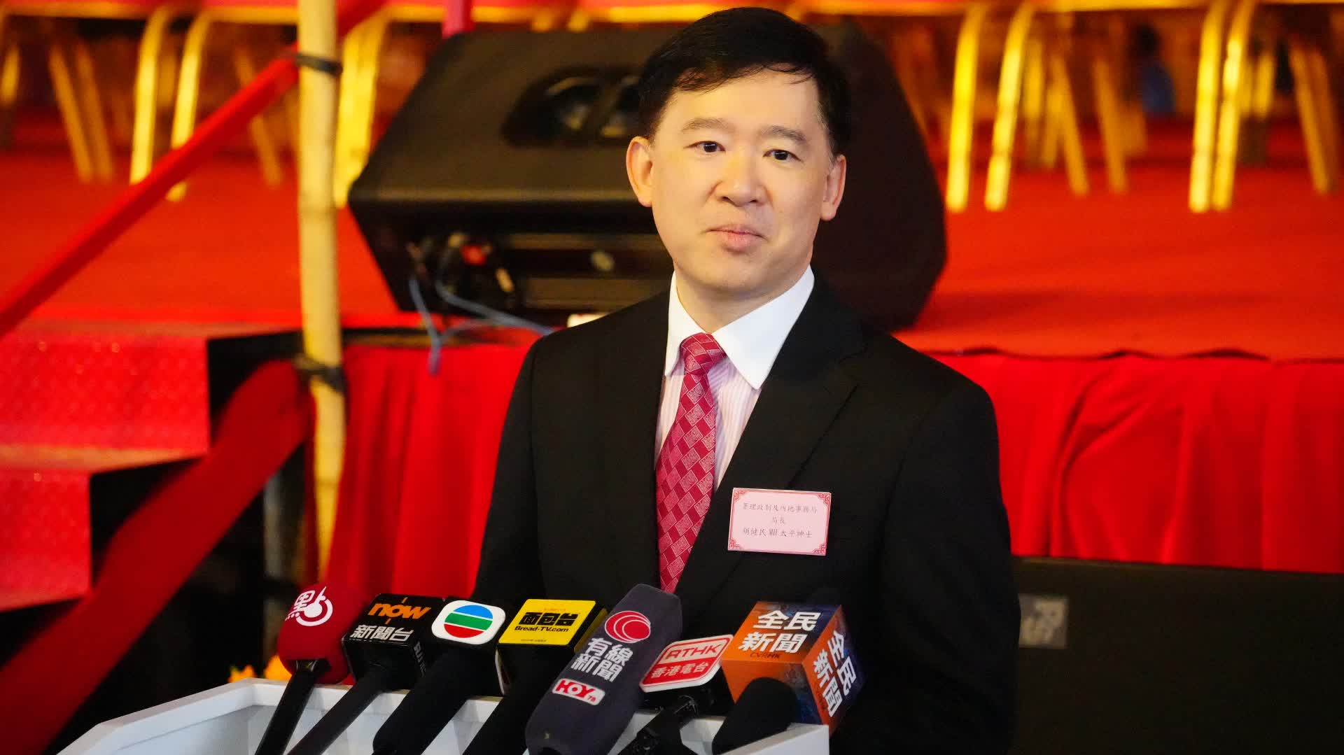 大公文匯全媒體報道,署理政制及內地事務局局長胡健民今日(17日)會見傳媒時被問到局長人選的進展,他表示沒有進一步消息,而新任政制及內地事務局常務秘書長已經接任,局內上下會努力做好工作。至於大埔宏福苑的長遠安置方案,他就說政府會適時公布。 在被問到新年的活動可吸引多少遊客,或者創造多少經濟效益。胡健民說,據他所知,這15日會有很多遊客到訪林村,不論是購物、許願或參觀壁畫等,是一個很開心的地方,每年不單吸引香港和內地居民,還有很多外國的遊客慕名而來林村。希望大家丁財兩旺,多消費、多支持本地企業,過一個好開心的春節。