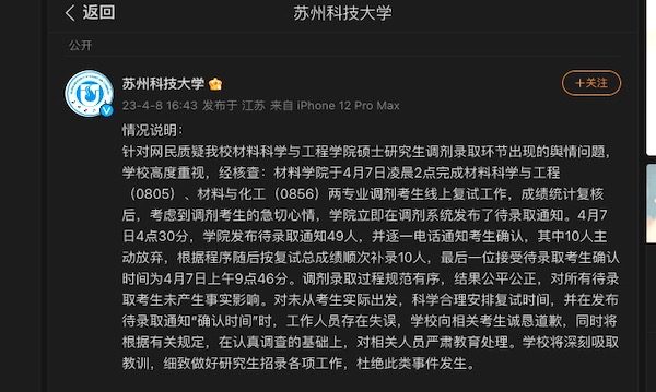 在舆论压力下,8日下午4时43分,苏州科技大学发布“情况说明”,证实该校材料科学与工程学院硕士研究生调剂待录取通知是4月7日凌晨4点30分发送,并逐一电话通知考生确认,其中10人主动放弃,根据程序随后按复试总成绩顺次补录10人,最后一位接受待录取考生确认时间为4月7日上午9点46分。该说明强调录取过程规范有序,结果公平公正,只是工作人员存在失误,学校向相关考生道歉,对相关人员教育处理等。