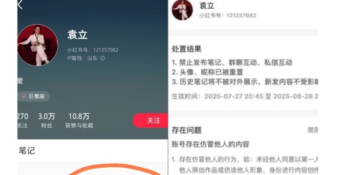 网上一度流传袁立今年7月28日发布的帖文显示:“从微博到抖音,至视频号,再到小红书,全部给封了,这小红书仅蹦了没几天。现在仅仅给我留下微信朋友圈。在一个视频时代、网络信息时代,这就等同于坐牢。”