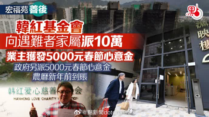 韓紅基金會向香港火災遇難者家屬每戶派10萬 向業主發5000元春節心意金Ta Kung PaoWednesday, February 04, 2026 08:42:20 AM UTC2月4日起,北京韓紅愛心慈善基金會將向大埔宏福苑火災168名遇難者的家屬提供10萬元慰問金,並向8座樓宇的業主發放每戶5000元春節心意金。什麼是血脈相連?是火災第二天立即響應捐款。 是攜手同心,守望相助。 是你需要什麼,我就送什麼。Read full story on Ta Kung PaoShare this story on:-