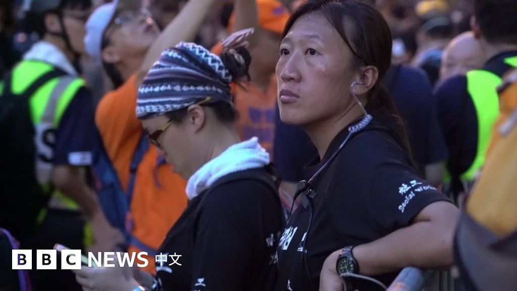 她站在警察和示威者中间,一手提着扩音机,一手拿着麦克风。她头扎马尾辫,脚蹬运动鞋,穿着印有“我们是社工,守护公义”的黑色T恤,是少有的不戴头盔、眼罩等防护装备的人。她身高并不出众,夹在多数是男性、身材高大的警察和抗争者之间,往往看不到她的身影。