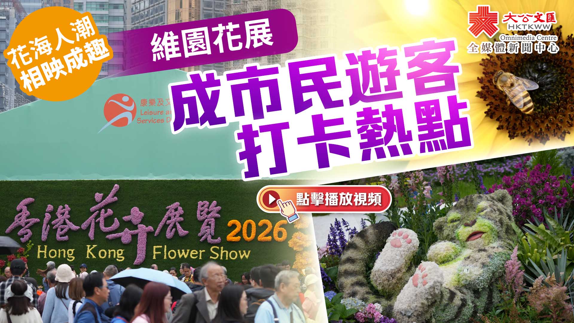 大公文匯全媒體報道,由康樂及文化事務署主辦的「香港花卉展覽2026」昨起(20日)至本月29日在維多利亞公園舉行。今年展覽以紫羅蘭為主題花,主題定為「花語尋『香』──細味城市特色」,匯聚超過200個本地、內地及海外機構與團體參與,為春日香港增添繽紛色彩。 花展開幕第二天,記者在現場所見,各色花朵爭奇鬥艷,開得正好,包括紫羅蘭、向日葵、碧桃、小木槿、三角梅等。現場人頭湧湧,市民及遊客紛紛前來觀賞,大家拿出手機拍攝花朵,並與家人親友在花前合影留念。 五大園林造景展現香港風情