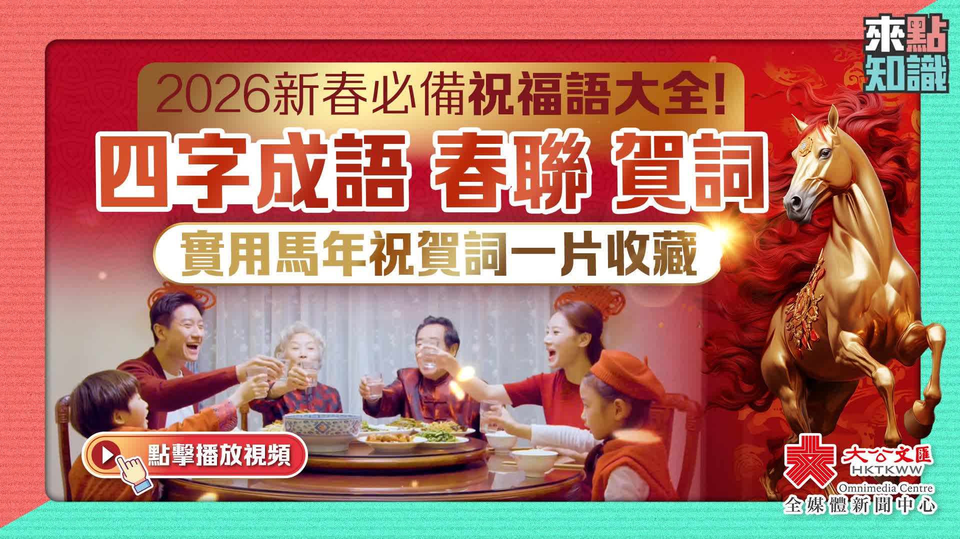 新年到,祝福到!當拜年詞庫告急,只會說新年快樂、恭喜發財時……別急,你專屬的「吉祥話小老師」已到!「馬」是12生肖中第7個生肖,象徵自由、勇往直前、忠誠及才華等吉祥寓意。學會這些和馬相關的吉祥話,無論領導、同事或親朋好友,一起解鎖——讓紅包更鼓、笑容更甜、好運加倍的新年「開口福」!
