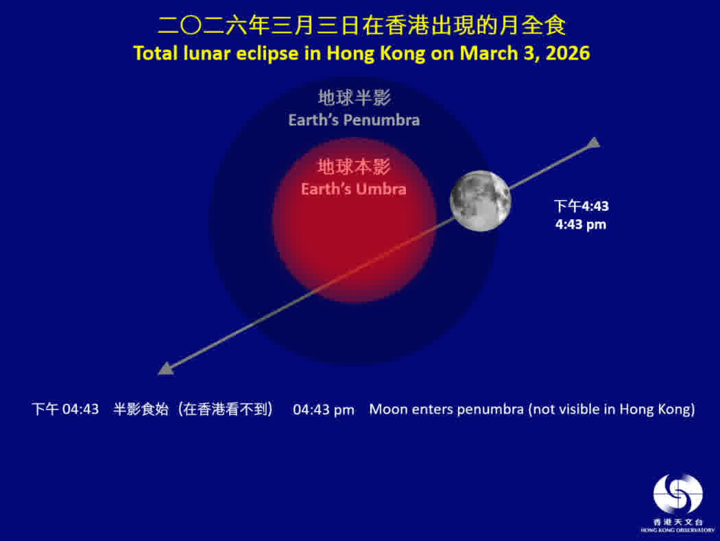 天文台今日(20日)提醒,香港上空3月3日元宵節傍晚將出現月全食。若天氣情況許可,市民可以肉眼直接觀賞月全食過程,面向東方而沒有障礙物的地點都適合觀賞這次月食。今次月全食階段歷時59分鐘,期間月亮不會從視線中完全消失,而是呈現暗紅色、即是「血月」。
