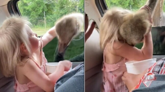 The video shows Emma first feeding the birds at the Tennessee Safari Park in Alamo. She is seen holding a bucket of food and feeding the birds from inside the car. Then, suddenly, she grabs an ostrich by the neck and hugs it. The bird tries to free itself and the little one appears a little disappointed with it.