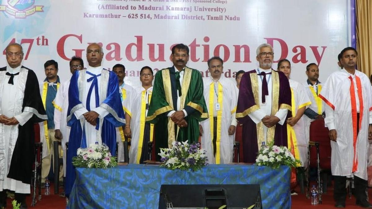 Thiruvalluvar University Registrar emphasizes perseverance at Arul Anandar College's 47th graduation ceremony celebrating 575 new graduates.