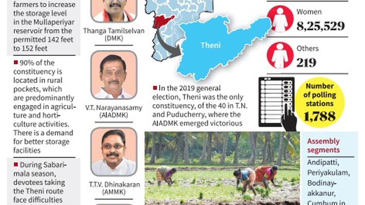 This time, the BJP-led NDA has given this seat to AMMK founder T.T.V. Dhinakaran, who was previously elected as an AIADMK MP from the constituency in 1999 when it was called Periyakulam. The DMK, which heads the INDIA bloc in the State, has fielded Thanga Tamilselvan, a former protégé of Mr. Dhinakaran. While the AIADMK has fielded its Theni East Union secretary V.T. Narayanasamy, the NTK has fielded J. Madhan.