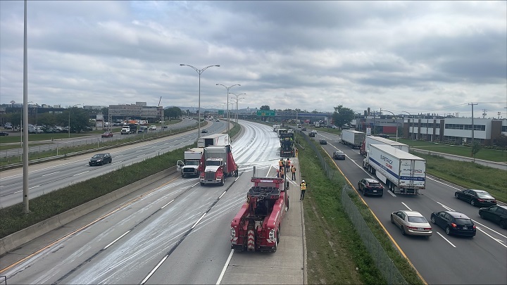 Quebec’s transport ministry told Global News it appears the containers in which the paint was stored were leaking, causing the paint to spill onto the road covering all three eastbound lanes.