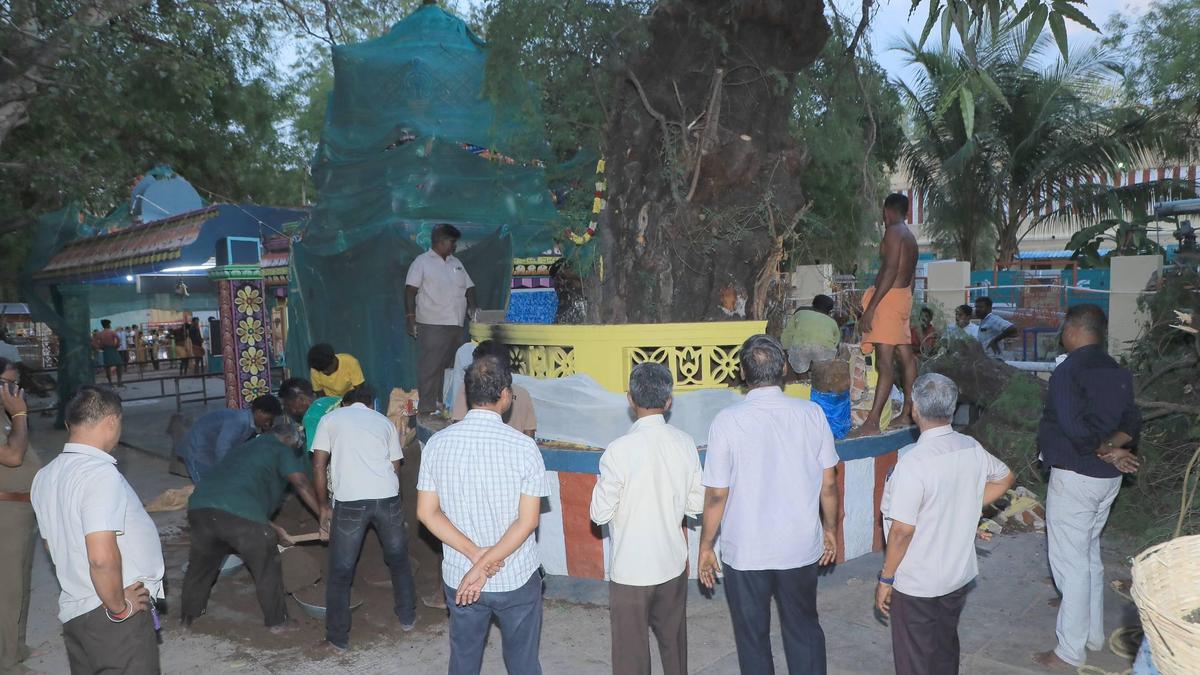 Ancient ‘Vanni’ tree at Sri Meenakshi Sundareswarar Temple tilts; steps on to restore it