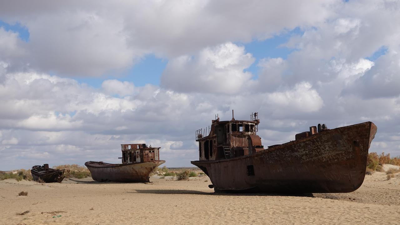 Unter einem Wolkenmeer liegen in der früheren Hafenstadt Mujnak durchgerostete Schiffe im Wüstensand. Das Wasser ist schon seit Jahrzehnten weg. Vom riesigen Aralsee, der in Usbekistan und im Rest Zentralasiens einst für Leben sorgte, sind hier heute nur noch Schautafeln übrig, die sein Verschwinden dokumentieren.
