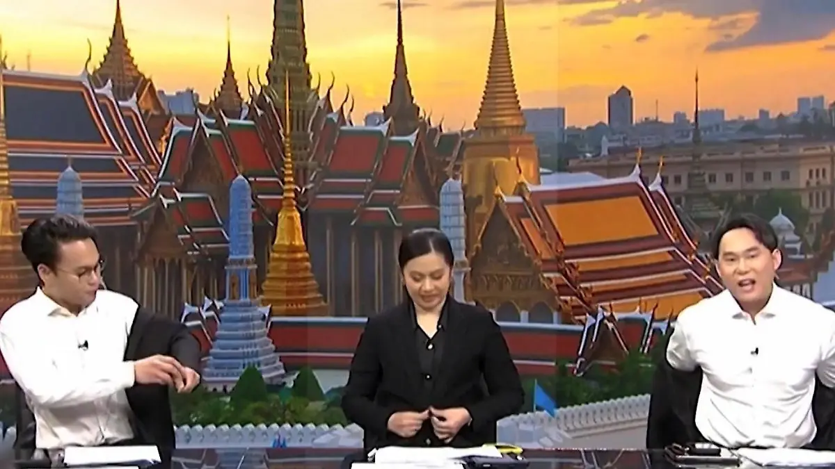 Diese TV‑Moderatoren aus Thailand ziehen sich freiwillig aus. Während einer Live‑Sendung berichten sie erst über die aktuellen Meldungen, kurz darauf muss das Jackett weg.