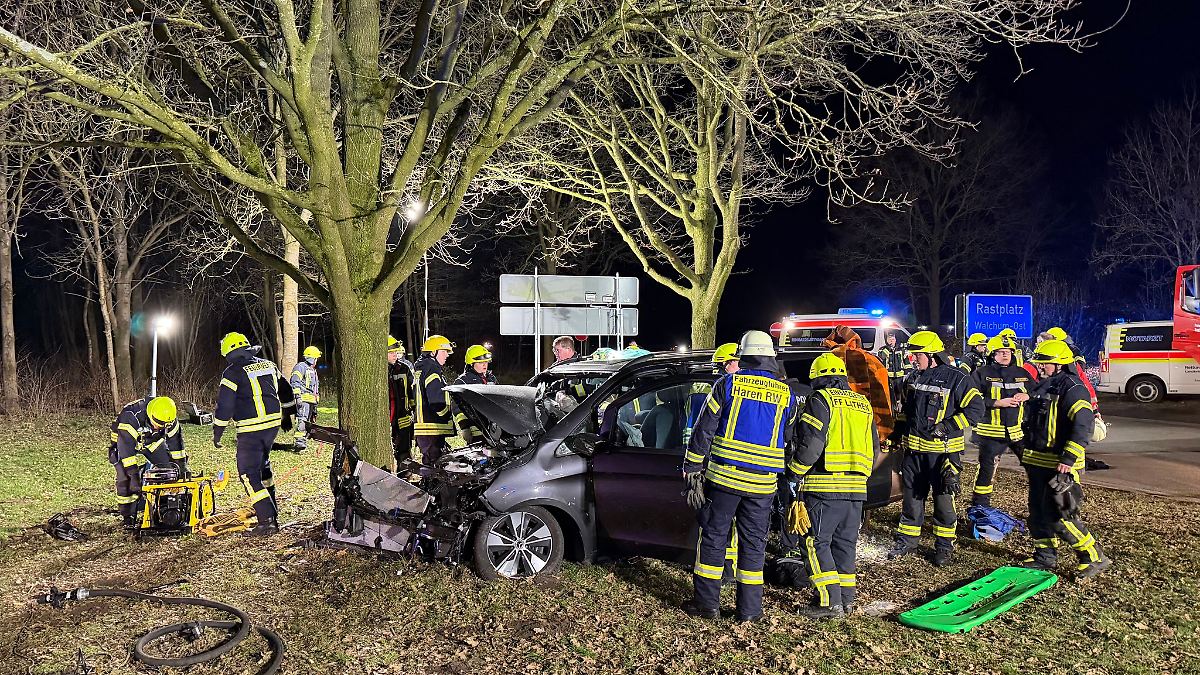 Das Auto mit insgesamt sechs Insassen sei auf der Rastanlage Walchum Ost von der Fahrbahn abgekommen und gegen einen Baum geprallt. Weil der Wagen stark deformiert war, habe es rund eineinhalb Stunden gedauert, die eingeklemmte Beifahrerin zu befreien.