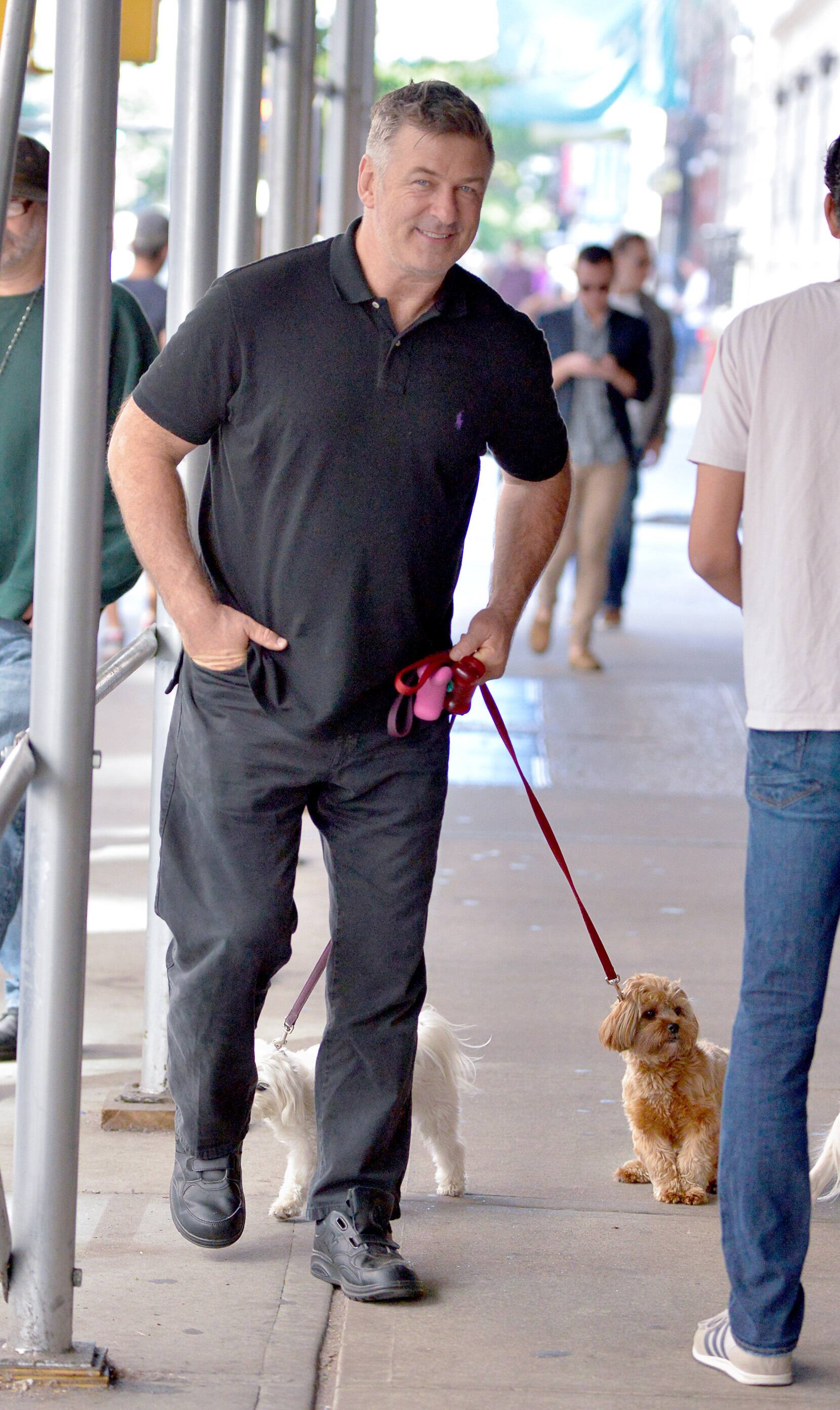 Baldwin, entièrement vêtu de noir et de gris foncé, semblait abattu sur les photos, alors qu'il déambulait avec sa femme, Hilaria, 37 ans, ainsi que leurs enfants.