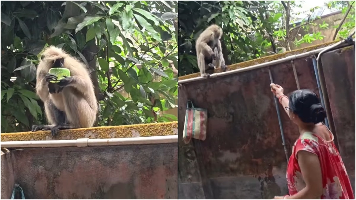 Bengali mother scolds monkey for eating soap, hands it a potato instead
