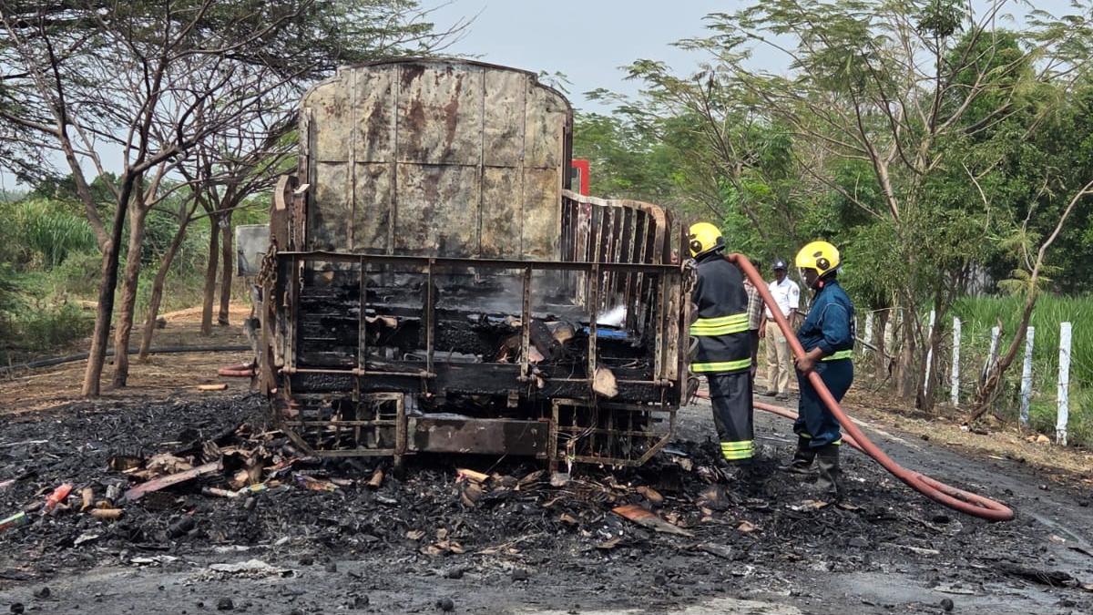 According to the police, the vehicle came in contact with an overhead high-tension wire, triggering a blaze that quickly engulfed the lorry. Both drivers, identified as Ayyapan and Sattivel, managed to jump out of the vehicle and escape safely.