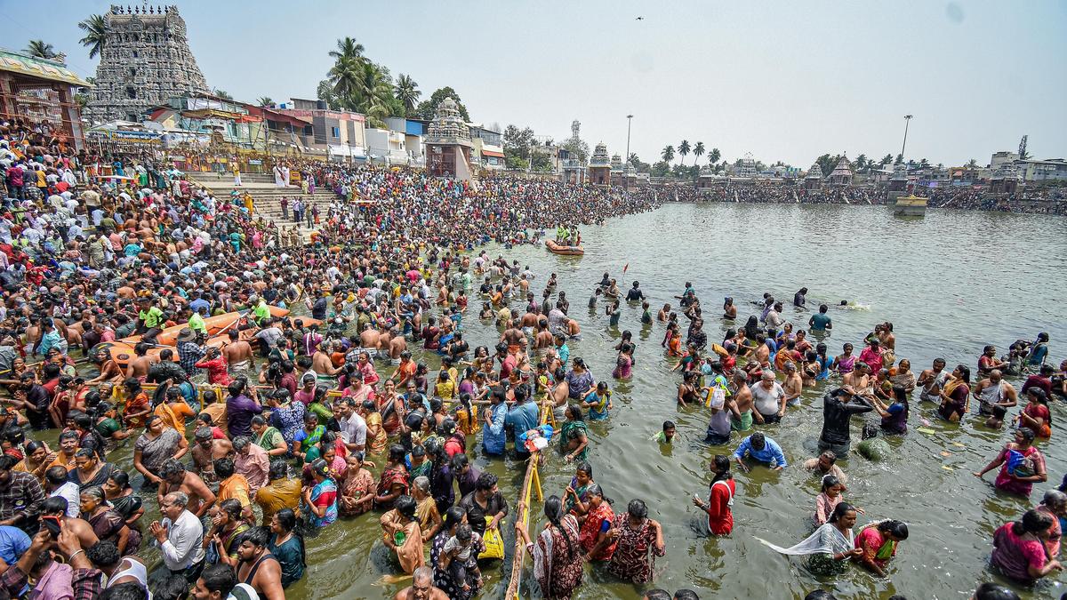 Devotees in large numbers took a holy dip in the Mahamaham tank at temple town Kumbakonam in Thanjavur district on Monday on the occasion of ‘Maasi Maham’ that was celebrated with religious fervour. Processional deities from various Shiva temples in Kumbakonam town were brought in a holy procession to the Mahamaham tank where ‘abhishekams’ were performed to the ‘Asthra Devar’ followed by ‘Theerthavari’.