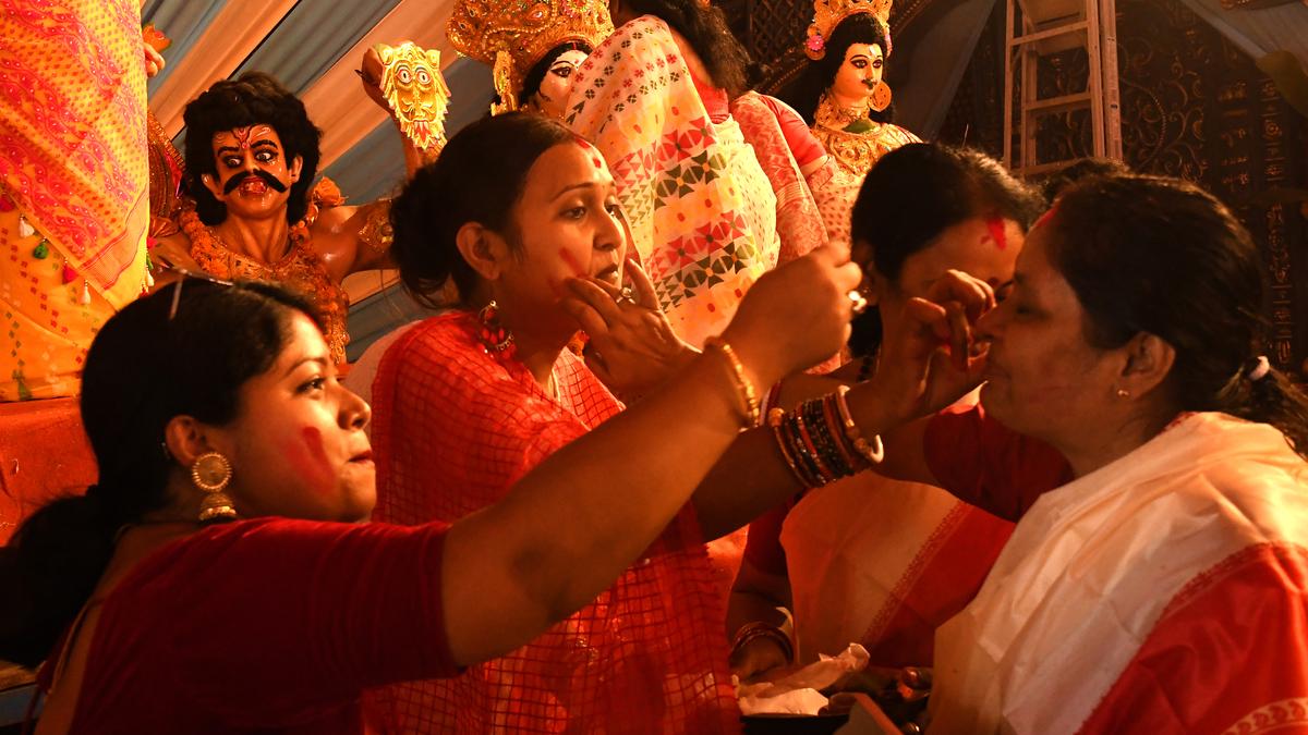 The immersion rituals commenced on Tuesday, following the final Vijaya Dashami puja performed on the idols. Hyderabad, home to approximately six lakh Bengali residents, boasts about 40 associations that contribute to the installation of these idols. The Hyderabad Bangalee Samity, one of the city’s oldest associations, conducted its final puja around 6 p.m. and embarked on procession to the lake at approximately 8 p.m. Given the proximity of their pandal from NTR Garden to Hussainsagar, it took roughly an hour to reach the lake and immerse the idol, said Biswajit Mukherjee, the Joint Secretary of the association.