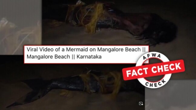 A video of what looks like a woman with her lower half covered in fish scales is circulating on social media with the claim that a mermaid was spotted on Mangalore beach. The ‘mermaid’, strangled with ropes and garbage, can be seen growling on the sand even as a couple of young men try to rescue her.