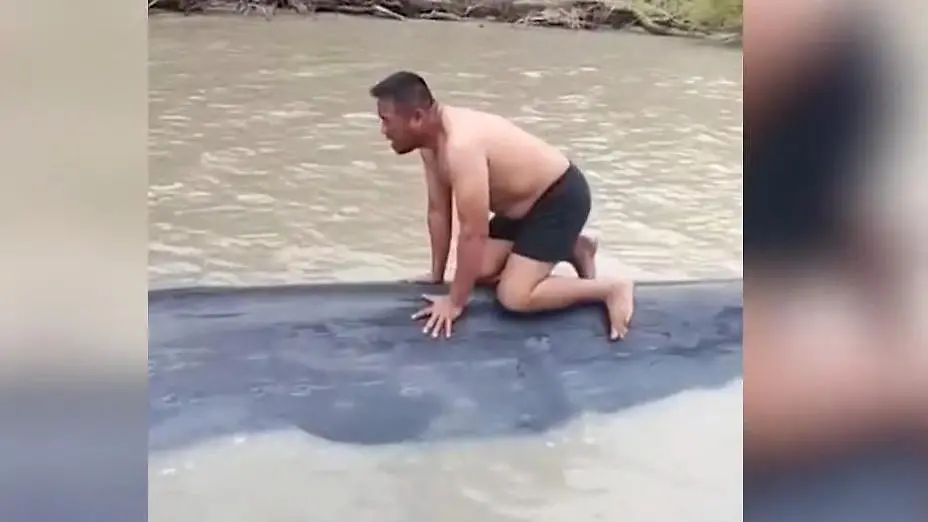 In Indonesien ist ein Wal gestrandet und kann nicht mehr atmen. Mutige Fischer versuchen, ihn zu retten und springen auf seinen Rücken