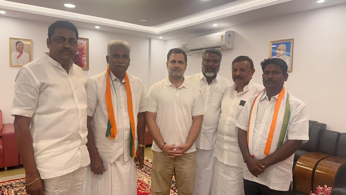 While the Puducherry Pradesh Congress Committee was arguing against the six party candidates who are in fray in constituencies allocated to the DMK and the VCK in the INDIA bloc, party senior leader Rahul Gandhi on Monday gave the ‘rebel’ candidates audience and posed for photographs with them at the airport when he was leaving after addressing a public meeting as part of the Congress campaign for the April 9 polls in the Union Territory.