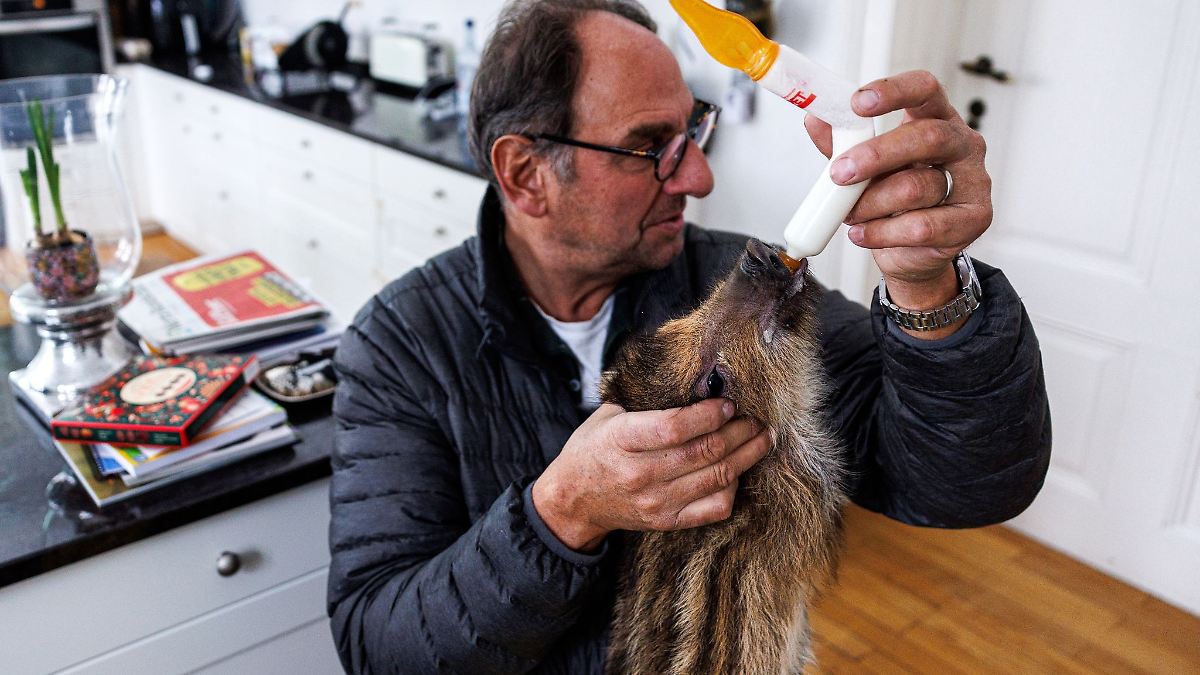 Ein Jäger fand die Jungtiere Anfang Dezember verwaist im Wald und brachte sie zu den Kaldens. Das Paar zieht die Frischlinge seither in seinem Wohnzimmer mit der Flasche auf. "Mit den jungen Tieren hier im Haus zu wohnen, ist eigentlich eine sehr erfüllende Sache", sagt Tierarzt Kalden. Im Stall könne man nicht so genau kontrollieren, ob sie sich wohlfühlten und was zu machen sei. "So leben sie mit uns zusammen, haben keine Angst vor Menschen, und dadurch hat die ganze Familie auch eine Menge Spaß mit ihnen."